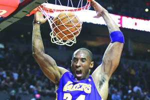 4月9日,湖人队队员科比在比赛中双手扣篮。当日,湖人客场以86比93不敌开拓者,遭遇四连败,仍排在西部第二。当场比赛,科比得了24分。