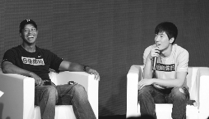 4月13日,刘翔(右)与美国高尔夫名将“老虎”伍兹在活动中对话。当日,在耐克公司的策划下,泰格·伍兹造访北京,并与刘翔进行了一场体育明星间的对话。虽然两人不太搭界,但有一点相同:“老虎”和“飞人”目前都属英雄落寞,从而,惺惺相惜。活动中,他们激励中国青少年放松身心,积极面对困境和低谷,勇于迎接挑战。