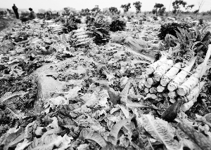 4月22日,在福州闽侯南通蔬菜生产基地,农民在菜地里加紧采摘莴笋,避免莴笋烂在田里。 由于近期北京、天津、浙江等12个省(区、市)先后从莴笋叶等蔬菜中抽检出极微量放射性碘-131,导致莴笋的销量骤减,进而波及到福州批发市场。目前,福州市闽侯、连江县等地莴笋出现大量滞销,一毛钱一斤仍然难以出售,大量销售不出的莴笋被销毁,菜农损失惨重。 新华社记