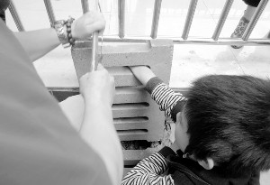 4月19日,吉首市八小一(2)班学生张维汉,不小心伸手去下水道取玩具,被下水道盖夹住后,经多位老师费尽周折才将他的小手取出。图为学校王副校长为解救张维汉小朋友用钢锯锯下水道盖。
