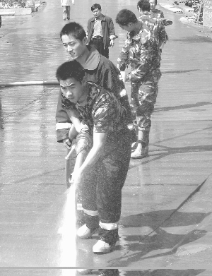4月26日,消防战士正与永顺县吊井乡吊井村村民联手冲洗村道。整脏治乱活动中,该乡党委、政府在村道旁添置了50个垃圾箱,新增1辆流动垃圾车,硬化村道2800多米,美化了乡村环境。