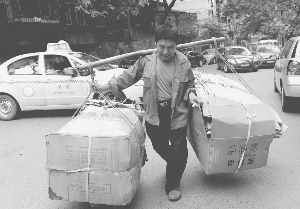 (网民观点)新浪重庆网友“五柳”说:辛苦的职业有千百种,每每看到重庆街头的“棒棒军”就觉得很心酸,都是五十多岁的农民,挑着那么重的东西,一次只能赚不到十块钱。