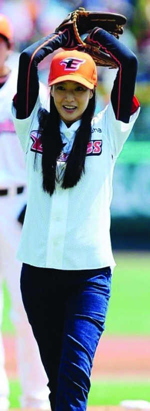 韩国女演员金喜善5月5日下午亮相韩国职业棒球联赛的一场比赛,担任了该场比赛的开球手。