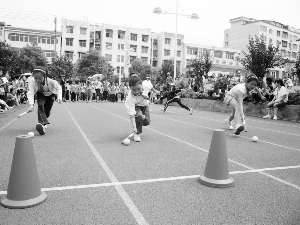 5月13日,龙山县第五小学学生正在进行赶球接力比赛。当日,该校第三届趣味性运动会拉开了帷幕。此届运动会共设立夹乒乓球跑、无敌风火轮、赶球接力、袋鼠跳等比赛项目。 向碧波 摄