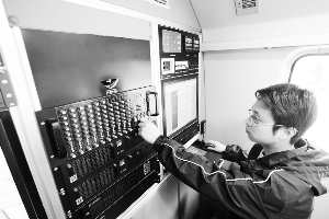 5月21日,湖北宜昌气象工作人员在气象应急指挥车内进行气象观测。
