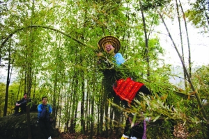寨后是对歌林,是瑶族青年男女对歌谈情的地方。一踏进对歌林,瑶女的歌声就把我们围住了。有人挺身对歌,可能是兴奋过头,唱得荒腔走调。几个瑶姑把他架到岩石上坐下,他洋洋自得。突然,有个姑娘一屁股坐在他的膝盖上,狠狠地顿,然后,一个接一个顿,把他顿瘫了,笑得我们差点背过气。这是瑶女在“打蹈”,也叫“顿屁股”,用于惩罚那些不安分的男人。笑闹间,不知何时有个姑娘吊在竹梢上,用竹枝做椅,用竹竿做索,由几个人拉住竹梢,晃晃悠悠荡起了秋千,看得我们又想又怕。这等奇思,恐怕只有花瑶人想得出。