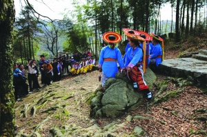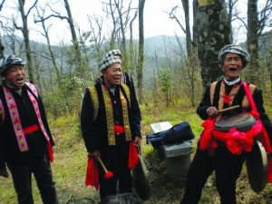 “呜哇呜哇”的高腔在树林中鼓荡,“咚哐咚哐”的鼓锣声在树林中激越。这是花瑶老人在给我们唱“呜哇山歌”,高亢、雄浑、悠扬、神秘。山顶是片平台,花瑶妇女散坐树下挑花。花布上的图案有虎、狮、龙、蜿、山、川、石、树等,精巧玲珑,古朴生动。挑花是花瑶的一门古老的技艺,瑶女们凭眼中所见,心中所想,下手就能挑出精美图案。她们的智慧、灵巧,在挑花上展现得淋漓尽致。