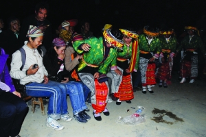 山高、路窄、弯急、坡长。车匍匐在坎边崖前,左甩右抛,挤进瓦屋砖楼相连、人群熙熙攘攘的乡场里。美导说进虎形山,到花瑶的世界了。花瑶是瑶族遗落在湘西南虎形山中一个分支,有6千多人,因穿得花花绿绿而得名。