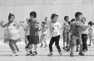 5月20日上午,凤凰从文广场上,一群幼儿园小朋友蹦蹦跳跳,排练舞蹈。据现场主持人介绍,这些幼儿园的小朋友正在彩排文艺节目,为迎接“六一”儿童节做准备。