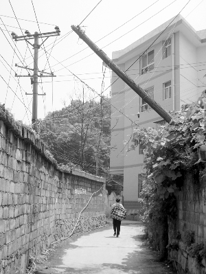 本报讯(记者 欧阳仕君)一根木质电线杆,在完成它的使命后,没有被及时拆除,却成了过路人的潜在危险。5月27日,一位读者向本报记者报料,吉首市砂子坳社区有一根斜倒着的木质电线杆,一直未得到处理,附近居民担心受到它的伤害。 报料人吴先生说,这根木质电线杆之前曾承担过线路运输任务,在一次电路改造后线路被移开,但电线杆一直未拆除。一年前,由于雨水冲刷,这根电线杆的根基松动,倒在不远处的电线上,随时可能倒下。记者到现场察看发现,这根木质电杆位于州电视台后面的小巷,长约两丈有余,杆的上头还有两个白色瓷球葫芦,瓷球葫芦上还挂着一些线头。杆倒在电线上后,两组正在使用的电线被压迫靠拢。 吴先生的邻居说,半个月前,他们曾打电话给社区反映了这个情况。社区的接线员表示即刻向相关部门反映。但至今未看到有任何的处理措施。 现在,吴先生和他的邻居们最怕下雨,担心下雨使斜杆的根基松动,斜杆随时有可能砸到地面,砸伤行人。 在现场,记者还观察到,斜杆百米以内还有多处树枝压在电线上的情况。 |