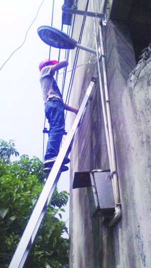 图为工作人员正在安装崭新的路灯。
