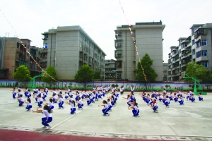近日,龙山四小正在举行“旭日东升武术健身操”比赛。该校一负责人介绍,武术健身操于今年5月纳入学校大课间操。武术健身操将武术的基本动作与广播操形式结合创编而成的民族形式的健身操,将武术动作与体操节拍相结合,动作简单易学,以“抱拳礼”开始、“抱拳礼”结束,有利使中小学生从小受到“学拳先明礼,尚武先崇德”的武术礼仪文化熏陶。
