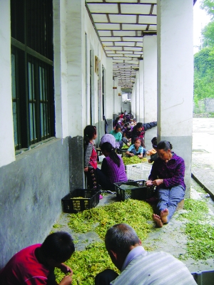保靖县野竹坪镇充分发挥地处白云山的气候优势,采取“公司+基地+农户”经营模式积极发展金银花种植,推进规模经营。2008年以来,完成整地6000亩,连片定植金银花3500亩。今年,电棚村1500亩进入采摘期,并喜获丰收。图为6月16日,村民给镇内加工大户交售金银花场景。
