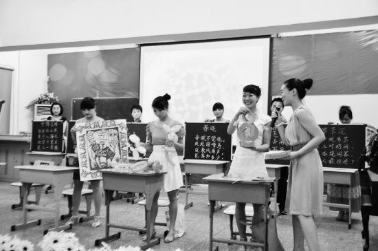 实习生石亚芬(右二)在展示自己的立体剪纸作品