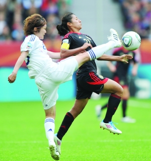 7月1日,日本队球员阪口梦穗(左)与墨西哥队球员斯特凡妮·马约尔争抢。当日,在2011年德国女足世界杯B组比赛中,日本队以4比0战胜墨西哥队。 新华社记者 武 巍 摄