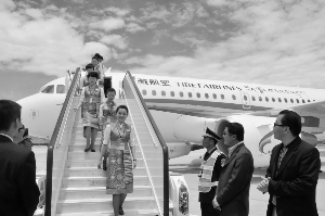 7月2日,西藏航空公司首架飞机空客A319成功飞抵拉萨贡嘎机场,身着藏式空乘制服的空乘人员走下飞机。