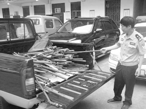 7月20日,吉首市公安局治安大队民警在吉首闽湘钢铁有限责任公司集中销毁缴获的涉案物品,共计赌博机20台,管制刀具300余把,镊子40把和黄碟350张。