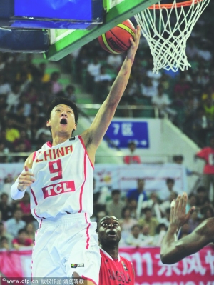 8月6日下午,中国男篮国家队队员孙悦在比赛中突破上篮。当日,2011年斯坦科维奇杯洲际篮球赛广州站比赛中,中国队迎战安哥拉队。中国队尽管半场领先11分,但第三节太放松被对手追上,最后时刻王仕鹏三分不中,中国队52比55不敌安哥拉队,在斯杯中遭遇五连败。