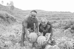 8月5日上午,笔者在泸溪县浦市镇麻溪口村土地整理项目现场看到,满坡满岭的西瓜地,结满了西瓜,瓜农们正忙着采摘、挑运、装车。今年66岁的杨元有老人,在年前新开发的荒山上,种植了10多亩西瓜,目前已有3万多元的收入。图为杨元有夫妇在瓜地里抱着快熟了大西瓜,乐不可支。