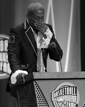 8月12日,罗德曼在2011年美国篮球名人堂入选仪上发言时落泪。当日,2011年美国篮球名人堂入选仪式在美国马萨诸塞州的斯普林菲尔德举行,“大虫”罗德曼在宣读自己的入选感言时几度哽咽,这位桀骜不驯的NBA巨星真诚地感谢他的家人和历任教练。 罗德曼在上世纪八九十年代,先后代表活塞、马刺、公牛、湖人和小牛队征战了十余赛季,曾两次荣膺NBA最佳防守奖。他曾两次帮助活塞队、三次协助公牛队,共五次夺得总冠军。在球场外,罗德曼以异装癖、彩色头发等等成为了大众关注的“话题人物”。