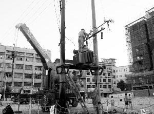 连日来的高温酷暑天气,使永顺县用电负荷急速攀升。为确保给广大市民正常供电,县电力公司员工不顾30多度的高温,奋战在炎炎烈日下,检修电路,以确保整个永顺电网的安全。图为8月19日,该县电力公司员工在检修县政府附近的变压器。