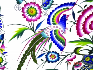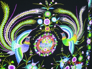画中的图案取材于苗乡的自然景物、生产生活及民风民俗中,是苗乡里常见的一些物事,大都是鱼、鸟、蝶、蜻、龙、凤、兽、虫、枝、叶、花、果及花瓶、花窗、苗族女人、小孩等图形的组合。分开来看,每个图形个性鲜明、惟妙惟肖、活灵活现、神采飞扬。组合起来,就构成一幅主题明确、形象生动、情景交融、五彩斑斓的画。画的名称有“双凤朝阳”、“喜事临门”、“母女绣花”、“花开蝶舞”、“龙凤呈祥”、“鱼潜花草”、“虫环花枝”。幅幅呈现快乐、祥和、喜气、自在的格调。我想,如与这些画为伴,那么此生定会让人少了许多烦躁,平添许多欢娱。