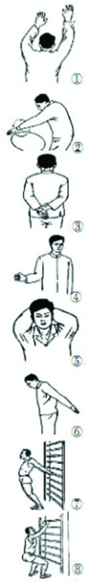 人到中年,身体各处都有点力不从心。特别是50岁后,由于长期伏案工作,肩部的肌肉韧带长期处在紧张状态下,患上了扰人的肩周炎,又称“五十肩”。 除了肩部活动减少这一主要的致病原因外,年龄、肥胖、炎症、创伤、遗传等因素也是原因。肩周炎的主要症状主要表现为肩部疼痛、肩关节活动受限、怕冷、压痛等。 一旦患上肩周炎,服用止痛药只能暂时缓解症状,而且停药后多数会复发。锻炼是较佳的防治方案,若能坚持效果更佳。 1.爬墙运动:面对墙壁,用双手或单手沿墙壁缓慢向上动,上肢尽量高举,再缓缓向下回到原处,反复数次。(见图①) 2.弯腰晃肩法:弯腰伸臂,做肩关节环转运动,动作由小到大,由慢到快。(见图②) 3.体后拉手:患者自然站立,患侧上肢内旋并向后伸,健侧手拉患侧手或腕部,逐步拉向健侧并向上牵拉。(见图③) 4.外旋锻炼:背靠墙而立,握拳屈肘,手臂外旋,尽量使拳背碰到墙壁,反复数次。(见图④) 5.头枕双手:患者仰卧,两手十指交叉,掌心向上,放在头后部(枕部),先使两肘尽量内收,再尽量外展。(见图⑤) 6.甩手锻炼:患者站直,做肩关节前屈、后伸及内收、外展运动,动作幅度由小到大。(见图⑥) 7.扶持牵拉1:用双手扶持身后的固定物体,挺胸挺腹,牵拉患肢向后。 (见图⑦) 8.扶持牵拉2:患者双手扶持固定物体(如床沿、桌边)做下蹲,然后用身体的重量牵拉患肢向上举直。(见图⑧) 请患者注意,以上8种动作不必每次都做完,可以根据个人的具体情况选择交替锻炼,每天3—5次,一般每个动作做30次左右,多者不限,只要持之以恒,对肩周炎的防治会大有益处。(郭万首) |