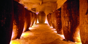 看了满满两仓颗粒饱满、散发清香的高粱和稻谷,感受酒厂丰富的粮食储备后,老龙带我走进酒窖。酒窖砖木结构的地表建筑斑斑驳驳,很不起眼。打开最底一层窖门往下走,探底后拉亮电灯,我被眼前的这座地下世界震惊了。眼前是数百个比我还高,两三个我都抱不拢的大瓷缸,分成两边整齐地排列着,中间是条米把宽的通道。我与老龙像阅兵似地迈上通道,边走边问老龙酒窖能储存多少酒,储藏最长的酒有多少年了。老龙说可储存五百多吨,储藏最长的酒已达十五年。老龙指着其中一缸,说储藏六年了。他边说边踩凳子,揭开缸盖,从缸里舀了一瓢递给我品尝。我喝了一口,香气氤氲,绕舌袅袅,唇齿生津,双颊欢畅。我第一次喝过这么地道的好酒,遂心生贪念,问老龙能不能送我两桶,老龙满口答应晚餐时送来。