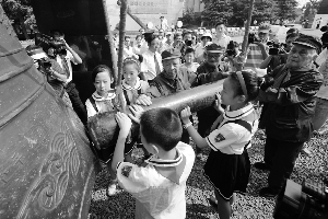 9月3日,抗战老战士代表和小学生代表共同撞响和平大钟。