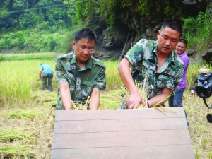 9月2日上午,泸溪县武溪镇黑塘村二组周国亮家的田里,15名镇干部与几个农民群众帮着抢收稻谷,有的割稻子、有的打谷、有的运谷子,大家忙得不亦乐乎。