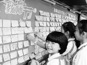 9月9日,在第27个教师节前夕,吉首市民族实验学校少先队发动的“我为老师送祝福”活动在全校各年级各班展开。学生们制贺卡正用自己的实际行动,为恩师送上最真诚的祝福。 图为六年级学生正在粘贴自己精心设计的“祝福卡”。