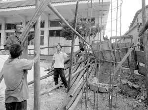 9月7日,三名施工人员对吉首市白岩乡白岩中心完小的新修校门进行定桩,新校门将于国庆节前竣工。