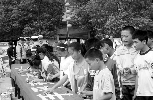 9月13日,花垣县第二中学组织初一年级全体新生到边城广场参加“牵手平安·心连心”文明交通安全活动。此次活动由县教育局关工委和县公安局交警大队联合举办。图为花垣二中学生在活动中签名。