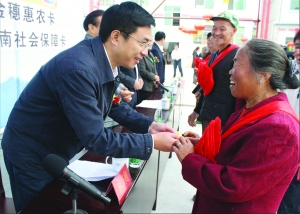 9月21日上午,花垣县城乡居民养老保险金首发仪式在该县团结镇政府大院举行,符合条件的2420名60周岁以上的农民率先领到了今年三季度的165元养老金。图为该县县委副书记、县长麻超正为农民发放养老金。 吴海波 摄