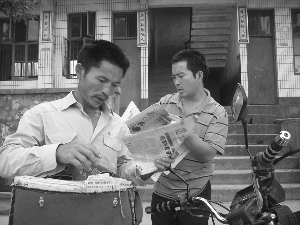 9月15日,永顺县毛坝乡邮递员李发友(左一)在给报刊征订户投送报刊。现年43岁的李发友是该县万坪镇杉木村人。10年来,他风雨无阻,每5天就要跑遍18个村子,将党报党刊及时送到客户手中。他告诉笔者,他月工资只有千元左右,但他喜欢送报刊。他干一行爱一行,忠于职守,爱岗敬业的精神,受到当地干群交口称赞。