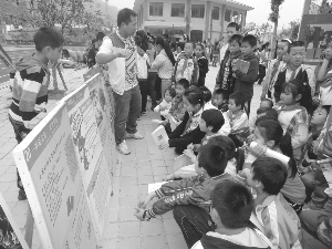 10月19日,吉首市八小组织五、六年级338名学生观看《禁毒图片》宣传展板。通过这个活动让学生初步了解一些禁毒知识和认识到毒品的危害性,教育学生们要远离毒品、珍爱生命。 图为该校五(4)班班主任黄增峰老师在给本班学生讲解毒品的相关知识和危害性。