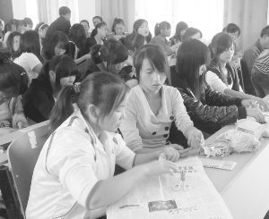 近日,保靖县职业中专学校特聘请该县水田镇民间艺人谭永平先生来校开展民族剪纸大课堂教学活动。图为学生在认真学习剪纸技艺。