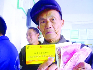 11月12日,泸溪县达岚镇达岚坪社区6组74岁农民康复忠(右)老人凭“湖南社会保障卡”在该镇邮局欢欢喜喜地取得了4个月的养老金220元。从本日起,该镇9个村55个组已年满60周岁的2040名老人,凭卡在当地邮局可以领到养老金,欢度晚年。
