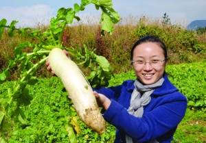 11月10日,龙山县石牌镇镇长杨甜展示她在大灵山桃兴村开展农民教育活动时帮助农民采收的大萝卜。