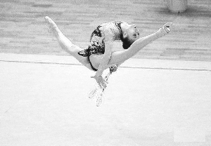 10月17日,广西队选手邓森悦在棒操比赛中。当日,在四川成都举行的2011年全国艺术体操锦标赛成年个人全能赛中,广西队选手邓森悦以105.725分的成绩获得冠军,辽宁队选手窦宝宝以100.250分的成绩获得亚军,上海队选手彭琳懿以98.825分的成绩获得季军。