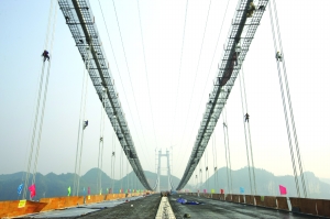 矮寨大桥建设指挥部副总工张永健告诉记者,大桥主体工程基本完工,目前正进行防撞护栏、风障、涂装防护等附属工程施工,桥面沥青铺设已经完成。