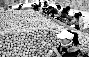 11月26日,永顺县芙蓉镇的中小学生把刚收获的柑橘套上保鲜薄膜。今年芙蓉镇万亩柑桔喜获丰收,很多鲜果需要采用保鲜措施急待装车外运,周末放假回家的中小学生看准“时机”,主动加入到柑橘保鲜“队伍”中来,按件数平均每人一天能挣20到30元不等的“工资”。一个名叫刘瑶的五年级学生把自己家里活忙完后,还在学习之余到别人家里去帮忙,她高兴地对笔者说:“我不仅学会了干农活,还挣到了自己的零花钱!” 罗 艺 摄