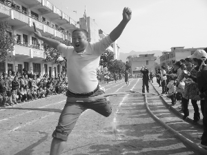 11月26日,龙山县召市镇小学一教职工在100米接力赛中冲刺。当日,该校教育工会组织全校教师举办了一场趣味运动会。本届运动会根据教师的性别和年龄分成13个小组,全体参与,分别进行了男、女教师拔河、100米接力等项目的角逐。整个比赛以“激情、活力、健康”为口号,体现了教师们“机智、团结、勇敢”的精神风貌和“更高、更快、更强”的竞技精神。