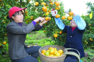 初冬时节,行走在泸溪县洗溪镇橘园里,果农们正在抢抓晴好天气,相互帮助,采摘 柑,到处是一片繁忙而又其乐融融的景象。图为泸溪县洗溪镇的橘农们忙着采摘 柑。 李焱华 摄