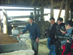 12月8日,永顺县吊井乡樟木村农民正在榨油坊蒸油茶籽粉,吸引了摄影爱好者前来拍照,感受和体验土家文化。该榨油坊历经百年风雨,是我州一座保存完好的原始人力榨油访,去年被申报省级非物质文化遗产保护项目。 吴 华 刘文化 摄