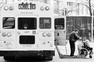 12月9日,一名校车司机在美国纽约市布鲁克林区的一所学校门前帮助一名坐轮椅的孩子上校车。