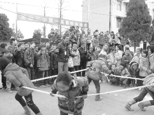 12月9日,龙山三小的学生正在开展多人角力比赛。当日,该校组织开展了趣味运动会,300多名师生参加了双人绑腿跑、蒙面敲锣、袋鼠跳、多人角力、钓鱼等13项赛事。 罗小飞 摄