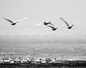 当日,荣成普降小到中雪,飞翔的天鹅与雪花相映成趣。