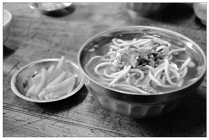 二 妹 摄 文/张正望 上世纪六七十年代,从州政府大院大门出来,靠右的马路边,有一家国营“五满意”饮食店。我喜欢吃粉的习惯,就是母亲在这里熏陶出来的。 “同志,巴(烫)碗粉,光头的。”母亲向柜台里端坐着的服务员递过去一角钱,然后从她手里接过一块二指宽的竹片做成的小牌子,便去另一边的窗口排队端粉。所谓“光头粉”,就是除了撒些葱花、姜末和一瓢猪骨头熬得清汤外,再没有任何臊子的汤粉。如果想点肉末,就得加5分钱。条件艰苦,那时娘儿俩经常是扯伙歹(吃)一碗粉。 后来5角,1元,一块五……随着改革开放不断深入,粉价开始逐年上涨,直到现在的5元、6元、7元不等,当然下粉的臊子也由单一的肉末、肉丝发展到品种繁多的排骨、牛肉、猪脚、鸭子肉、乳猪肉…… “走,歹碗粉去。” 早晨一觉醒来,许多吉首人不约而同地想到的,就是赶去吃碗热乎乎香辣浓味的米粉。走进粉店,接过老板递来的一碗热气腾腾的米粉,也不用人招呼,自己扯把小板凳,往大排档式的小圆桌边一坐,便稀里哗啦,连汤带粉刨得精光,把冷落了一夜的寡肠寡肚吃得饱满充实,嘴一抹,带着怡然自足的神情,便去开始新的一天紧张的忙碌。 如今,米粉已经成为很多吉首市民的早餐主食了,就是天天吃,也不觉得腻味。相反,只要几天不吃,就会像李逵所说的那样,口都会“淡出鸟来”。如果没有这米粉,很多吉首人的早餐或许都不晓得要吃什么了,那生活中不知要缺失多少快乐和味道。 吉首米粉与其他地方的一样,都是由米打碎加工而成,但吉首的米粉又很有特色。首先,粉有粗、细、干、湿、宽、圆之别,柔韧兼备,随你口味任意挑选;下粉的辣子,老板要亲自操劳,将精挑细选的干辣椒,切成指节般小段,温火炒香,再用擂钵一锤一锤地擂成细末,里面还要掺些盐、花椒之类的作料,米粉上不上口,辣子粉很关键;臊子有肉末、牛肉、排骨、猪脚、猪肚、牛肚、鸭子肉、乳猪肉、红烧肉、木耳肉丝、青椒肉片等品种,花样繁多,每一样臊子都突出本地口味。 老板烫粉时动作很优美,像是演绎一种劳动的艺术。看似随意从水桶里抓起一把米粉,手头上抻几下,便能定下一碗粉的标准。接着,用另一只手将缠绵不断的粉条掐断,随即执一漏瓢盛着,往锅子的沸水里一放,略略滚烫几个来回,迅即捞起,装进放好调料和少许汤汁的碗里。然后,询问顾主想吃点什么臊子的,老板总是大方地舀,舀一瓢不算,还要再添点。蒜茸、姜末、葱花、辣子粉、酸豆角、酸姜片、剁辣子、大头菜等配料,一边桌上放着,尽顾客自己斟酌。吃的主儿按自己的爱好,亲手放上适合自己口味的配料,拌上酱、醋、香油、芫荽,再夹几块用骨头汤煮好的海带。那一碗味道鲜美、香辣扑鼻、加进了自己想法的米粉便端到了餐桌上,惹人垂涎。吃一口,滑软细溜,润肠润胃,唇齿留香,妙不可言,那饱了口福后的身心真有一种幸福飘飘的感觉。 我每次出差回家,头脑里反复酝酿着要做的事情,就是打早美美地吃上一碗香喷喷的正宗吉首米粉。我也吃过别的一些地方的米粉,但不是细柔脆弱、缺乏自信,就是粗犷直爽、过于质朴,或者清汤寡水的,辣子粉粗糙疲沓,臊子总是放得寒酸,让人觉得小气吝啬,吃起来很不够味。 你只要稍稍留意,从一碗米粉里也能看出吉首人的个性。吉首人多是苗族,这是聪明、勤劳、耿直、善良、热情、勇敢的民族,除非自己没有,否则宁肯自己吃亏,都会倾其所有真诚招待客人和朋友,没有那么多弯弯绕。吃粉时,如是碰见熟人,双方都会争抢着要请客,这一个边掏腰包边说:“来来来,我一起送,刚好,我这里有零钱,不要找。”其实他不一定有零钱,不过是找一个请客的口实。那一个也不相让道:“哪里要你送,请都请不到你,今天火色(运气)好,碰到了,来,我一起送。”为表诚恳,他干脆冲着老板喊到,“老板,你莫收他的钱,等下我一起送。”弄得老板把已经伸出去准备收钱的手又缩了回去。有时一直互相巧礼,手里握着钱,你推我搡的,老板只顾笑,接谁的钱都不是,干脆转身忙自己的去了,等他们扯清场再讲。 倘若遇上合适的,恰巧又都好那么一口,一方会径直到柜上取几瓶“小角楼”或“歪脖子”之类的小酒,一边说着“来,我请客”,一边“嘭”的一声拉开酒塞子,就着那碗米粉,热热乎乎地喝上二两早酒。 有人摆吉首人的段子,说吉首人去外地出差,早餐也念念不忘米粉,用吉首普通话冲小吃店老板喊“巴碗粉”,老板没听清白,误会为要“八碗粉”。这段子姑且不论真假,倒是为吉首人对米粉的情有独钟做了最恰当的注脚。 朋友,如果你到吉首来旅游,或出公差,或办私事,不妨清早起来,歹一碗地道的吉首米粉,饱饱口福。当然,要享受这样地道的美味,你得到正宗的吉首米粉店去。 |