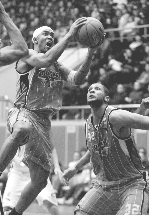 12月23日,北京金隅队球员马布里(左)在比赛中上篮。当日,在2011-2012赛季中国男子篮球职业联赛(CBA)第15轮比赛中,北京金隅队客场以101比105不敌佛山友诚金融队,13连胜的纪录终结。